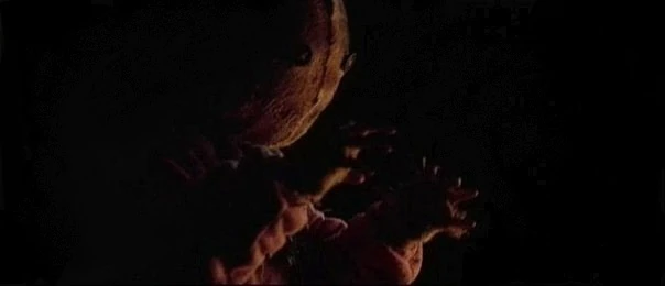 Sam's name originates from Samhain, the origins of Halloween itself. He is depicted as a child dressed in a Halloween costume, which consists of an orange set of pajamas, and a mask made of a burlap sack with buttons for eyes. Sam drags a dirty sack around with him throughout the film, but its contents are unknown, presumably candy; Although the blood stains on the sack and the cat screeches that are occasionally heard from it strongly suggest otherwise. Despite his childlike appearance, it is established that Sam is more demonic than he appears, hiding a pumpkin-shaped head resembling a skull. Dougherty described Sam's head as a cross "between an embryo and a pumpkin".[1] Quinn Lord, who plays Sam in the film, described his character as being a demon who was born in a pumpkin patch.[1]
